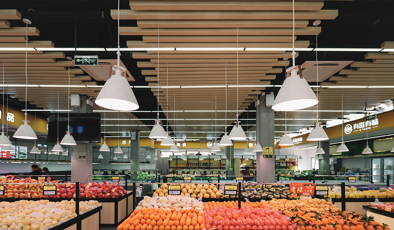 屋檐的概念由室外到室内。设计将建筑外立面的折线元素引入室内,演变成格栅屋顶,其造型和功能经过严格推敲,在保证屋檐下的2.9m/3.3m高度的情况下,选择最优尺寸为40mm的木格栅,格栅之间的间隔为80mm,呈170°角交错分布,形成了起伏的屋顶造型。屋檐下的小吃档口作为标准单元进行深化设计,从人体工学的角度,压低档口高度,满足人在使用上的舒适度。